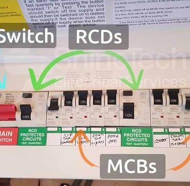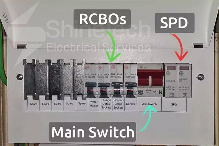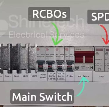 Optional extras such as SPDs are available on request. Most companies use split-way boards which are cheaper but only contain 2 RCDs which have 6 MCB circuits on them so if the RCD trips it will turn off the 6 circuits. That's why you should choose RCBOS for all breakers, this is an RCD and MCB into one so if the RCBO breaker detects a residual fault it will only trip one circuit and not all 6. See the reference photos below for more clarity